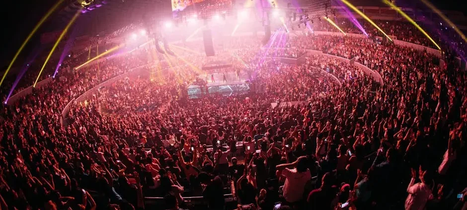 Vibrant crowd enjoying a live concert in a bustling Manila arena at night.